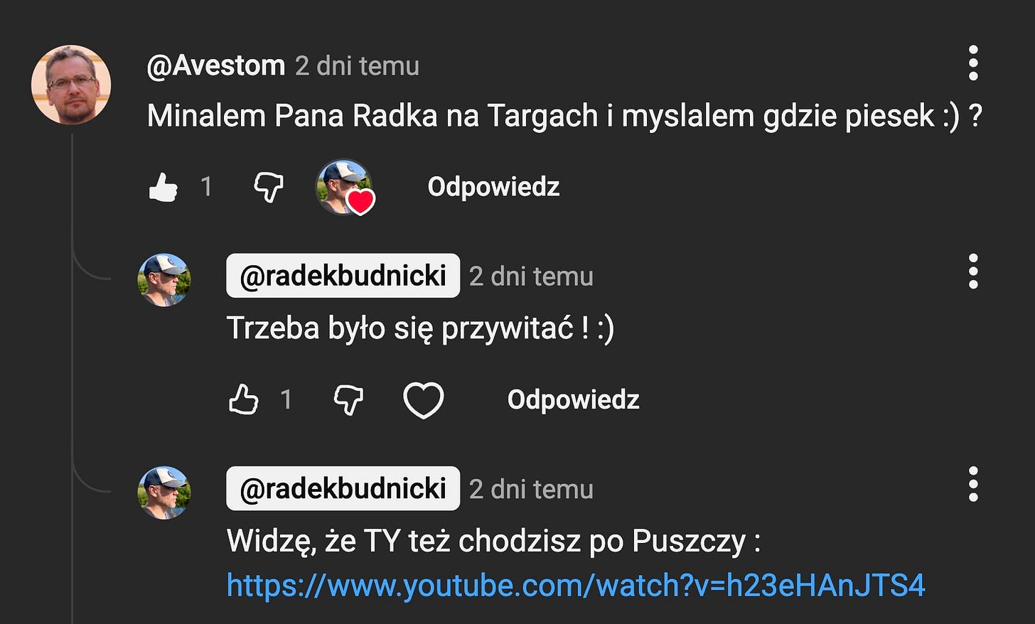 Zajrzałem na kanał autora komentarza i znalazłem filmy z lasu. Okazało się, że chodzimy po podobnych ścieżkach. Zaproponowałem wspólny spacer po Puszczy Knyszyńskiej. Zgodził się.